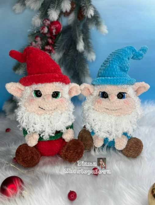 Ножки на шплинтовом креплении (может стоять и сидеть); тело-голова вяжутся одной деталью; ручки ввязываем по ходу вязания; щечки и ушки пришивные; нос и борода вывязывается по игрушке, колпак съёмный.